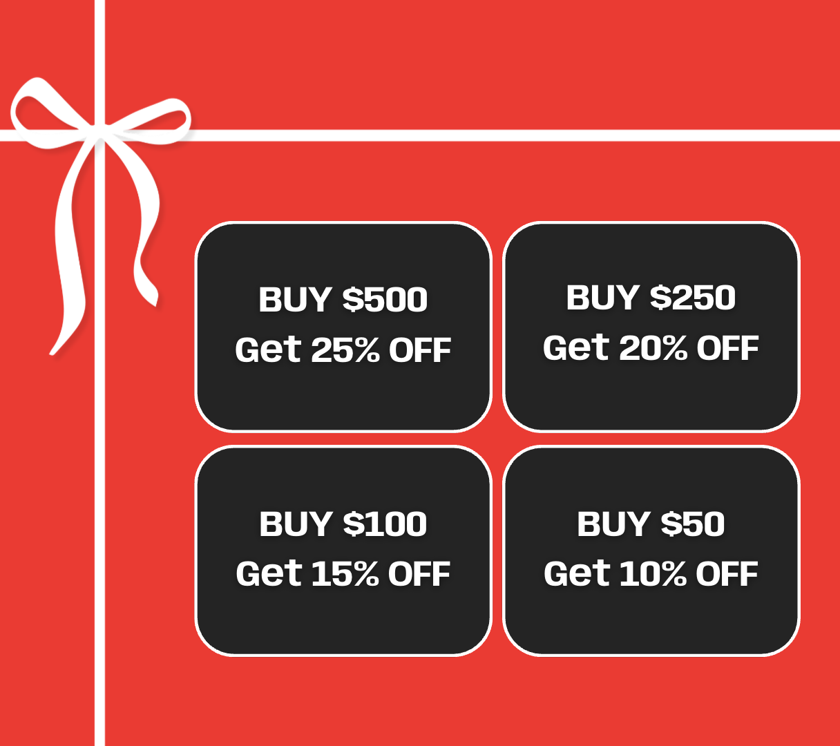 Our annual gift card sale is right around the corner! Purchase $50–$500 in gift cards and get up to 25% off — valid in-store and online from November 28 through December 7.